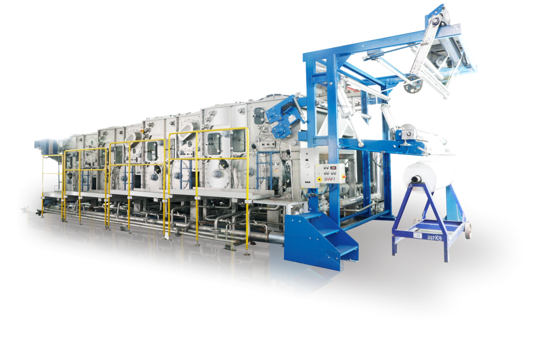 化纤布在热定形之前,需要经过除油水洗工序。高乐SINTENSA CYCLONE除油水洗机采用紧凑设计,配备有独立驱动的传动装置和自动张力控制系统,能均匀收缩含有莱卡的化纤针织布。在水洗技术方面,该设备通过喷淋和高速转子,增加水流穿透布料,发挥出色的洗涤效果,为染色均匀提供保障。