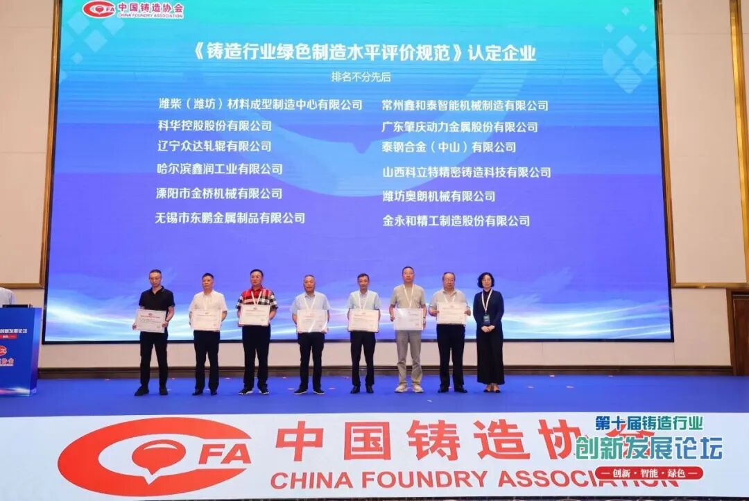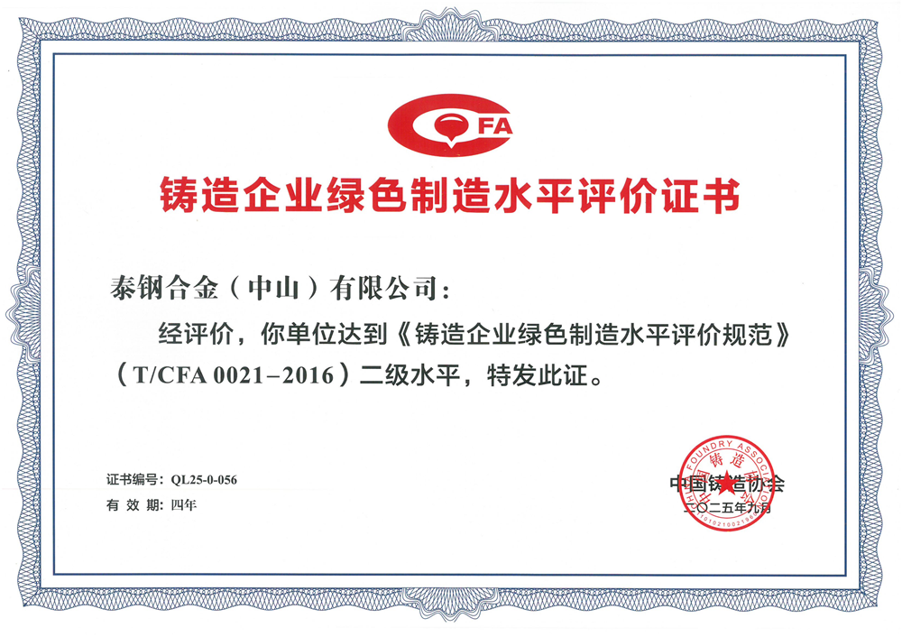 9月25日,以“创新·智能·绿色”为主题的第十届铸造行业创新发展论坛召开。论坛期间,中国铸造协会为通过铸造企业绿色制造水平评价规范认证的企业颁发了证书。泰钢合金(中山)有限公司(以下简称“泰钢合金”)凭借其在绿色制造领域的系统化建设与卓越实践,顺利通过评审,达到二级水平!