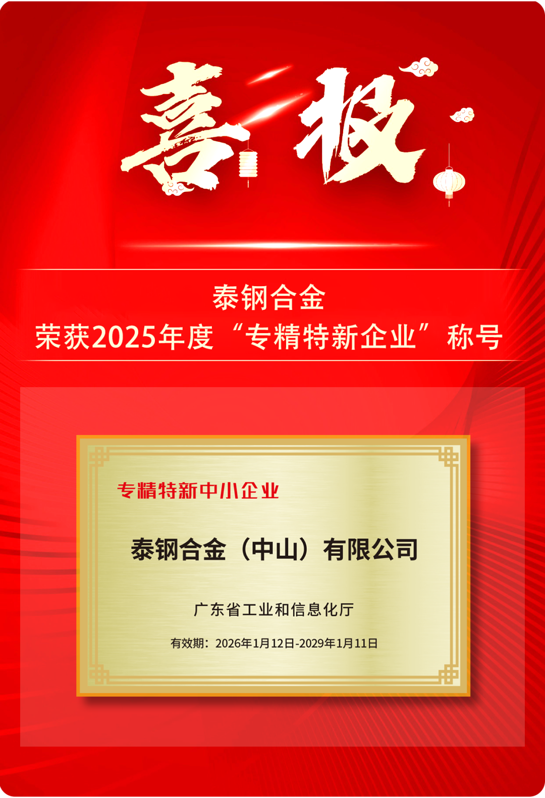 近日,泰钢合金(中山)有限公司(以下简称“泰钢合金”)凭借在特种合金铸造领域的深厚积淀、强劲的技术创新能力及精益化管理水平,荣获广东省工业和信息化厅颁发的2025年度“专精特新中小企业”荣誉称号!这一殊荣的获得,不仅是对公司深耕主业、精益求精发展理念的高度认可,更是对其在产业链关键环节核心价值的充分肯定。